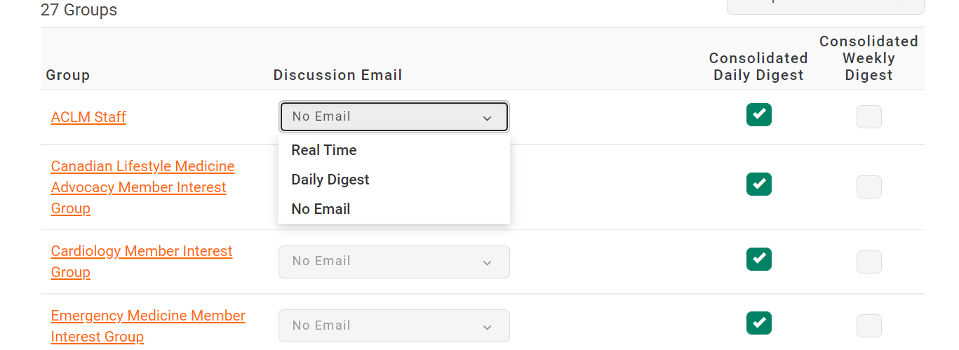 Discussion Email settings (none, daily digest, or real time) are specific to each group's discussion posts.
